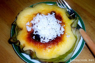 galapong, baked in a special clay pot, lined with a piece of banana leaf, with live coals on top and underneath. It is topped with slices of
